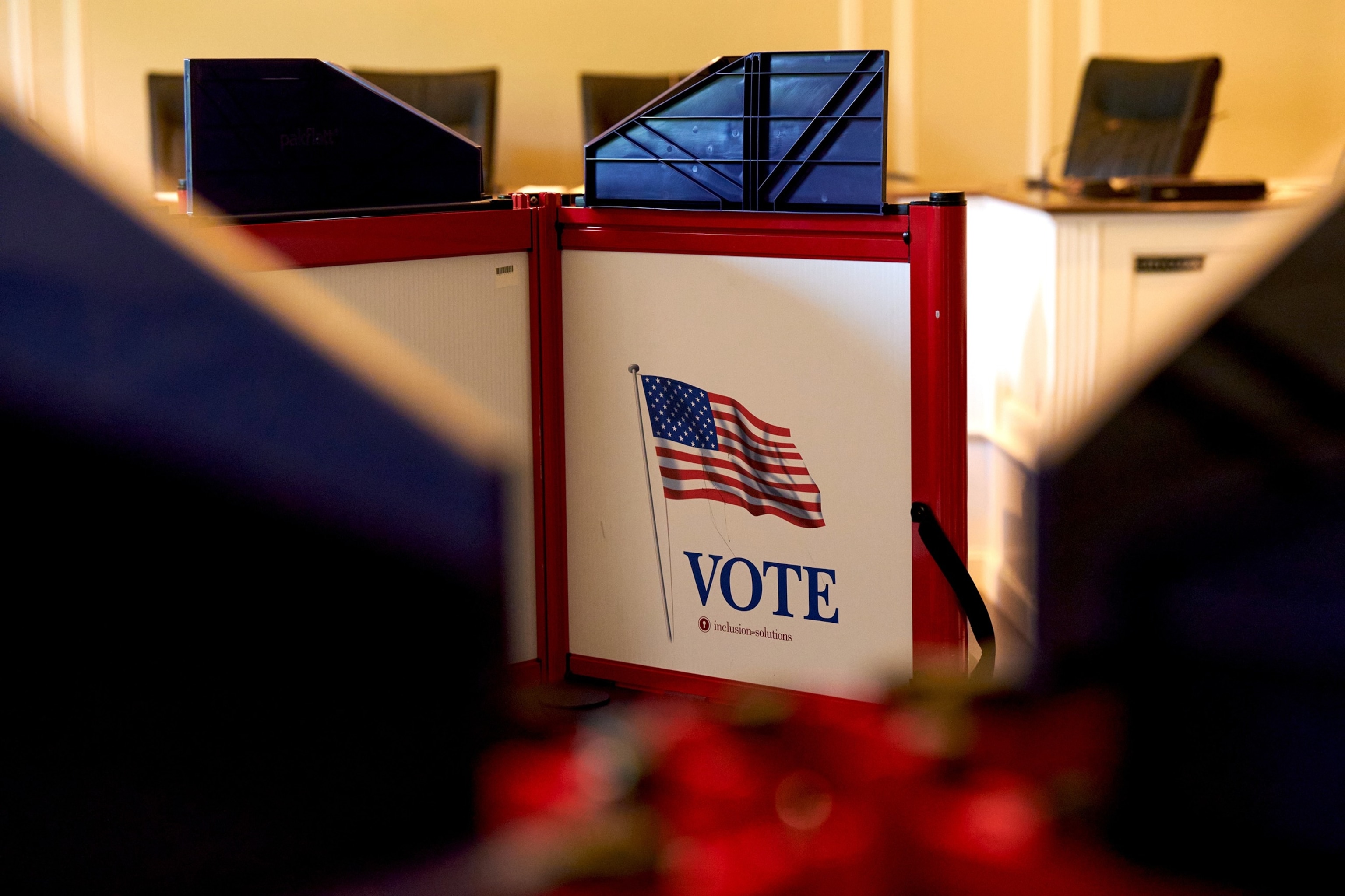 Voting booths at a polling station inside Rye City Hall in Rye, New York, June 25, 2024.